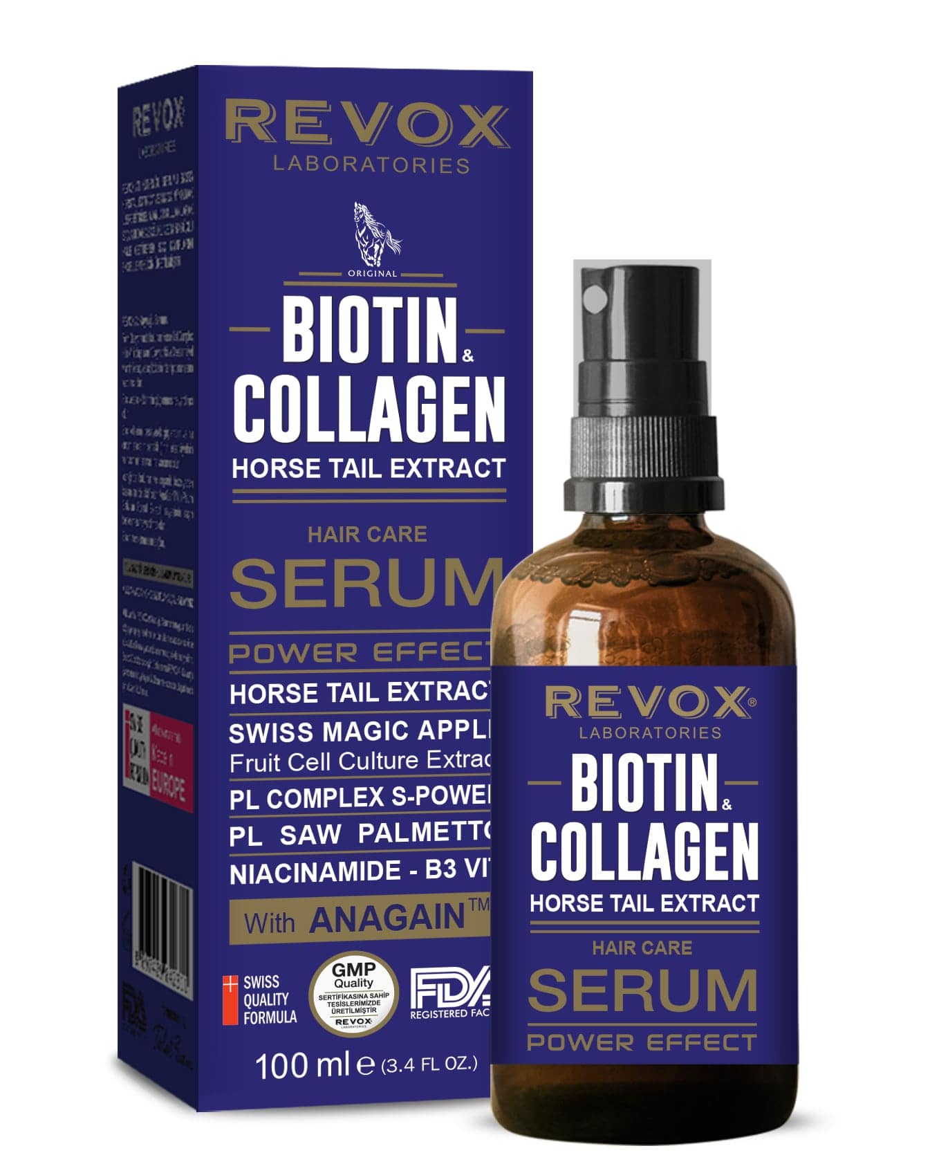 REVOX SERUM is produced to prevent hair loss by making hair more well-groomed and stronger by using BIOTIN & COLLAGEN & HORSE TAIL HERB EXTRACT, ANAGAINTM and many herbal agents. This hair serum is designed and manufactured for all hair types.
